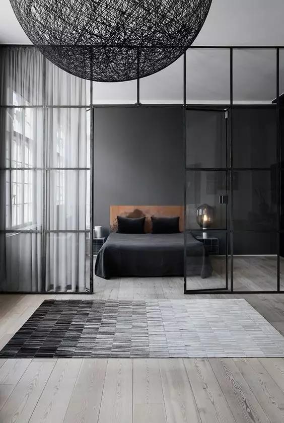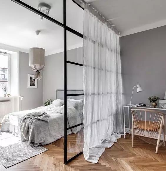 钛镁铝金的隔断门这两年非常火,黑色的铝金边框加上通透的玻璃,很好的做了阻断和通透空间的效果。用在卧室和客厅之间绝对不会出错,如果觉得太亮,在卧91桃色APP污污污加一圈窗帘就可以很好的遮光啦!