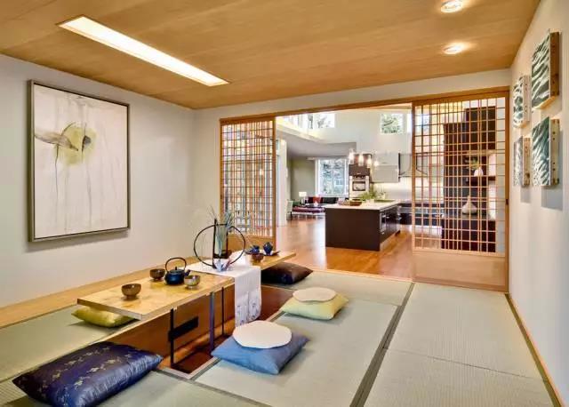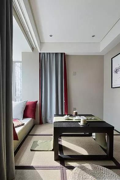 在榻榻米上置放上一个矮桌,平日里可邀上好友,品茶、对弈、聊天,承担着休闲茶室的功能,无论是闭目养神还是品茶,无疑都是缓解压力的方法。