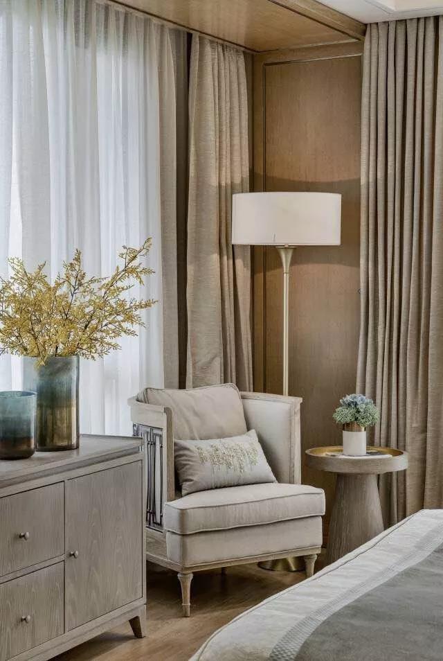 色彩方面不宜大面积的使用高饱和和高对比的颜色,面料尽量选择厚实有质感并且遮光效果好的,如果单层布料不能满足遮光要求,加上一层衬布不仅可以提升遮光效果 同时还具备保温隔音的效果,有效提升房间的舒适度。