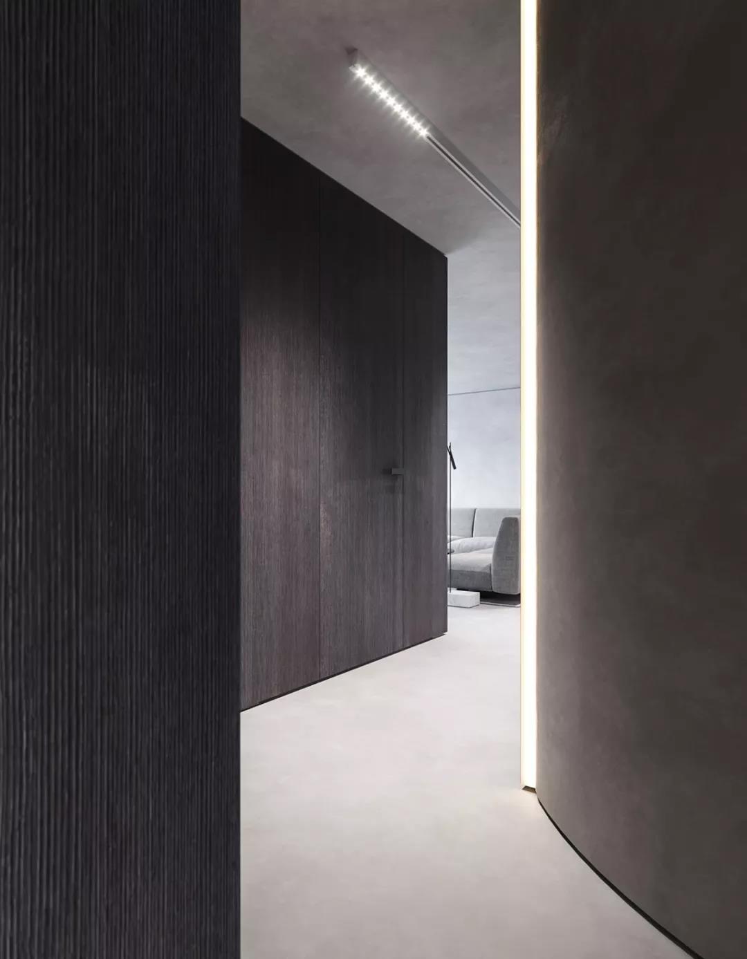 混凝土墙面与深色木饰面搭配