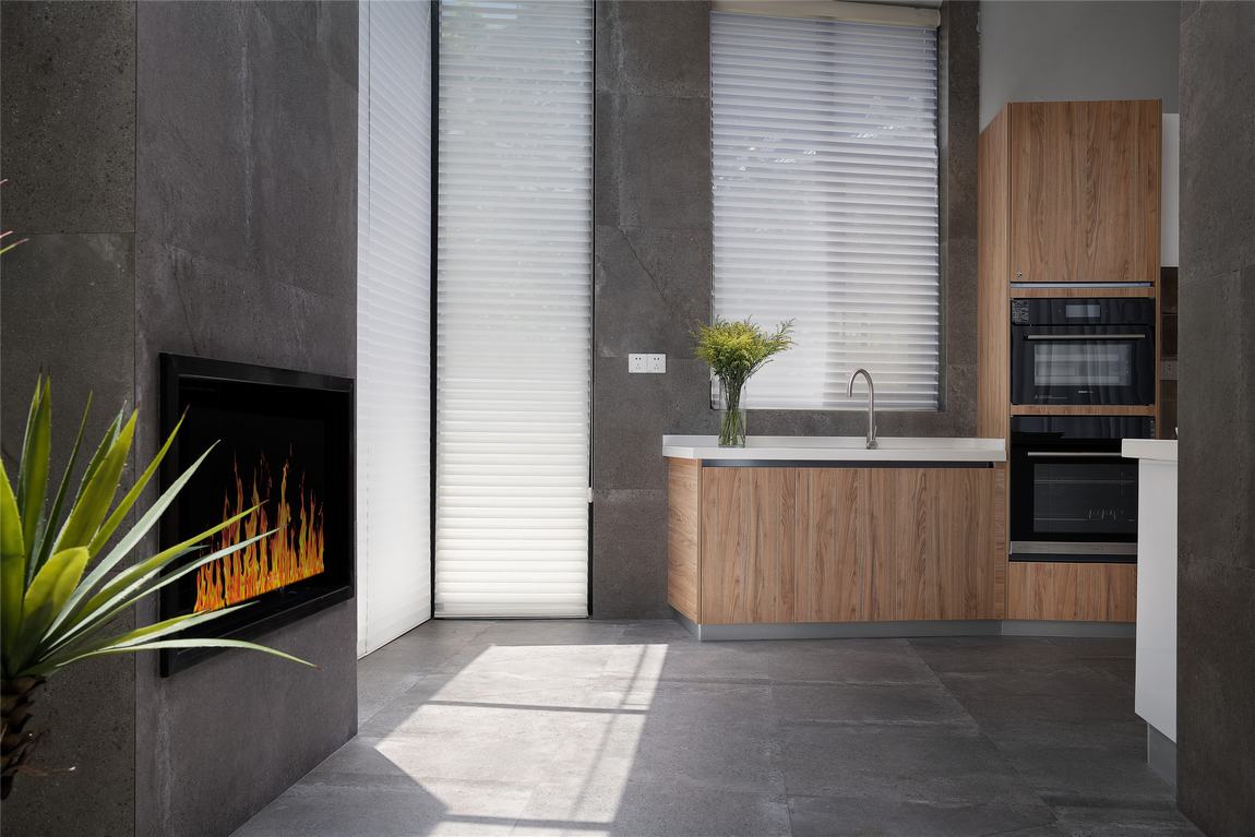 餐厅以灰色和原木色为主,简约,清新明丽,灰色的大理石墙面,与大理石地板呼应,形成视觉语言上的统一.原木色的橱柜,使得原木色加以贯穿,干净而又温馨的同时将空间得以延续.